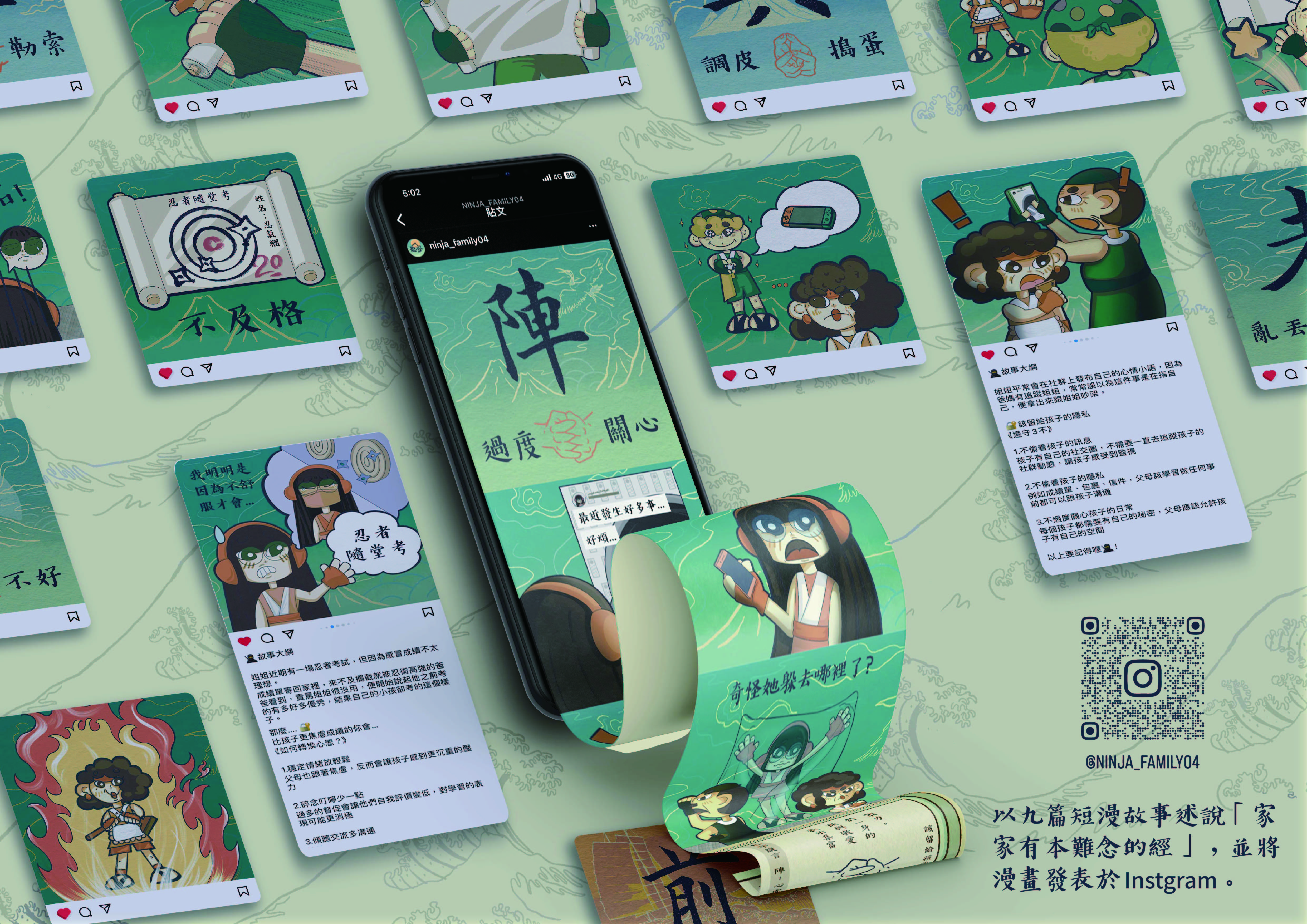 This is a design topic that explores family communication issues. It uses interesting and humorous cartoon content to describe the difficult parent-child communication problems of "every family has its own scriptures that are difficult to recite", and uses the character setting of "Ninja" to represent everything. The visual design of the family members who have to endure is in the style of Japanese comics.This special topic uses nine short comics to introduce different parent-child conflict stories. It hopes to provide parents with a healing channel while disciplining their children in a relaxed way, and to arouse empathy between parents and children, so as to find solutions to parent-child interactions.