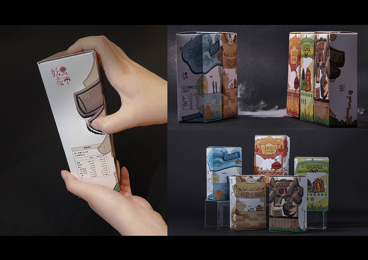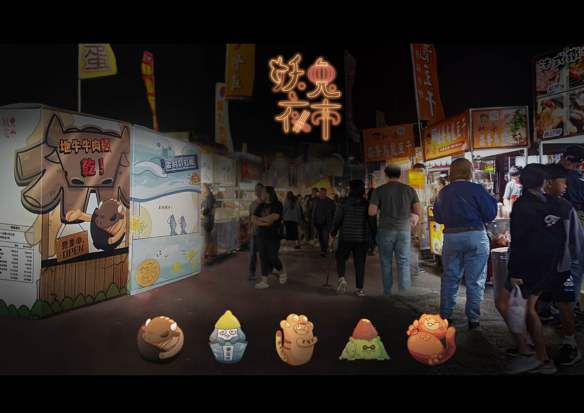 以”妖鬼”與台語” 枵鬼”發音上的雷同,將主題融合夜市美食,提升夜市美食包裝的展示性、收藏性及互動價值,展現獨特的「妖鬼夜市」風格,增加夜市美食的視覺魅力。