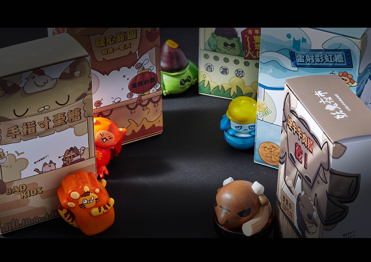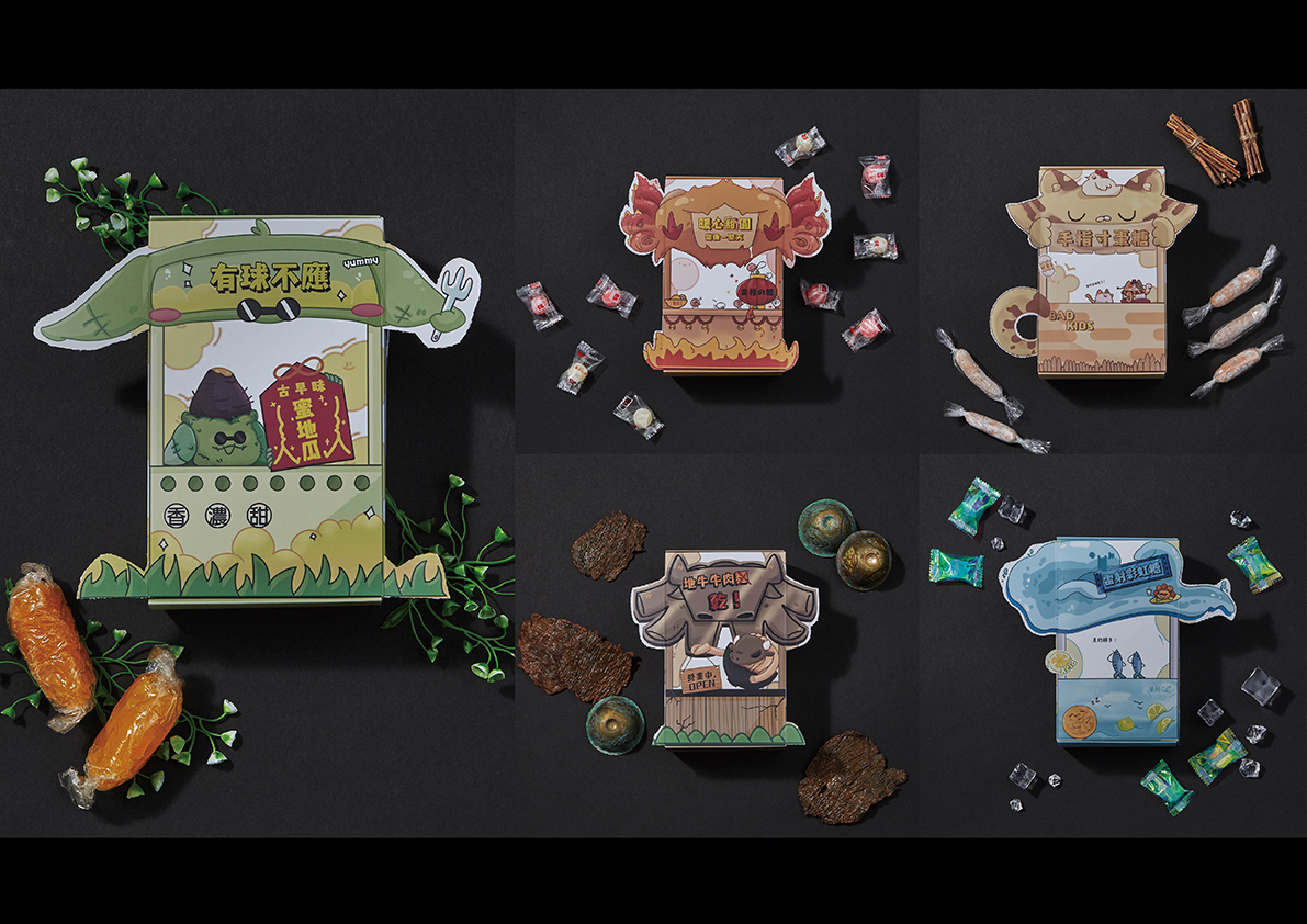 The pronunciation of "Yao Kwei " happens to be identical as "Hungry Ghost" in Taiwanese language, a clever creativity employed to merge with the theme of gourmet foods for night bazaar, and to upgrade the display of food package, collection, and interaction values. This unique "Hungry Ghost Night Bazaar" style also enhances the charming vision of foods at the same time!